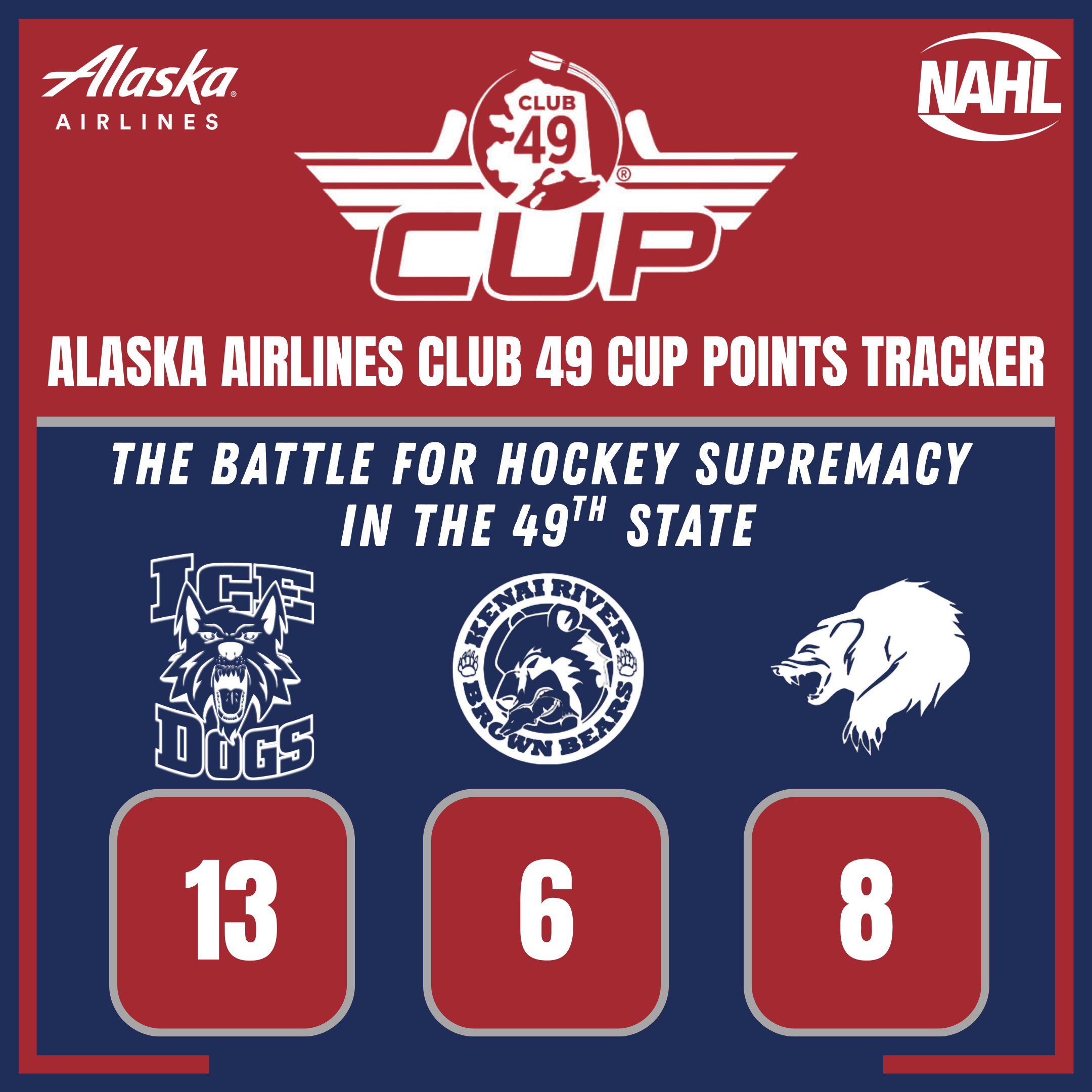 FAIRBANKS, ALASKA- The Ice Dogs enjoyed an off week as the rest of the playoff contenders in the North American Hockey League’s Midwest Division duked it on the final weekend of the regular season. The Dogs clinched the top seed in the midwest when the Janesville Jets buried an overtime goal to beat the Springfield Jr. Blues 5-4 on Friday. Springfield locked up second place with 9-4 pummeling of the Jets on Saturday, which also eliminated the Jets from playoff contention. The Anchorage Wolverines swept a 3-game series against the Minnesota Magicians to finish third, while the Minnesota Wilderness split a home and home with Chippewa to secure the fourth and final playoff spot in the midwest.